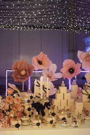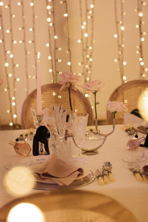 Rather than a traditional seated dinner, the experience was conceived as a narrative journey. Guests were invited to step inside the world of the fragrance, where design, scent and emotion converged around the table. Bold, immersive floral compositions and warm, enveloping lighting transformed the dinner into a moment suspended in time.